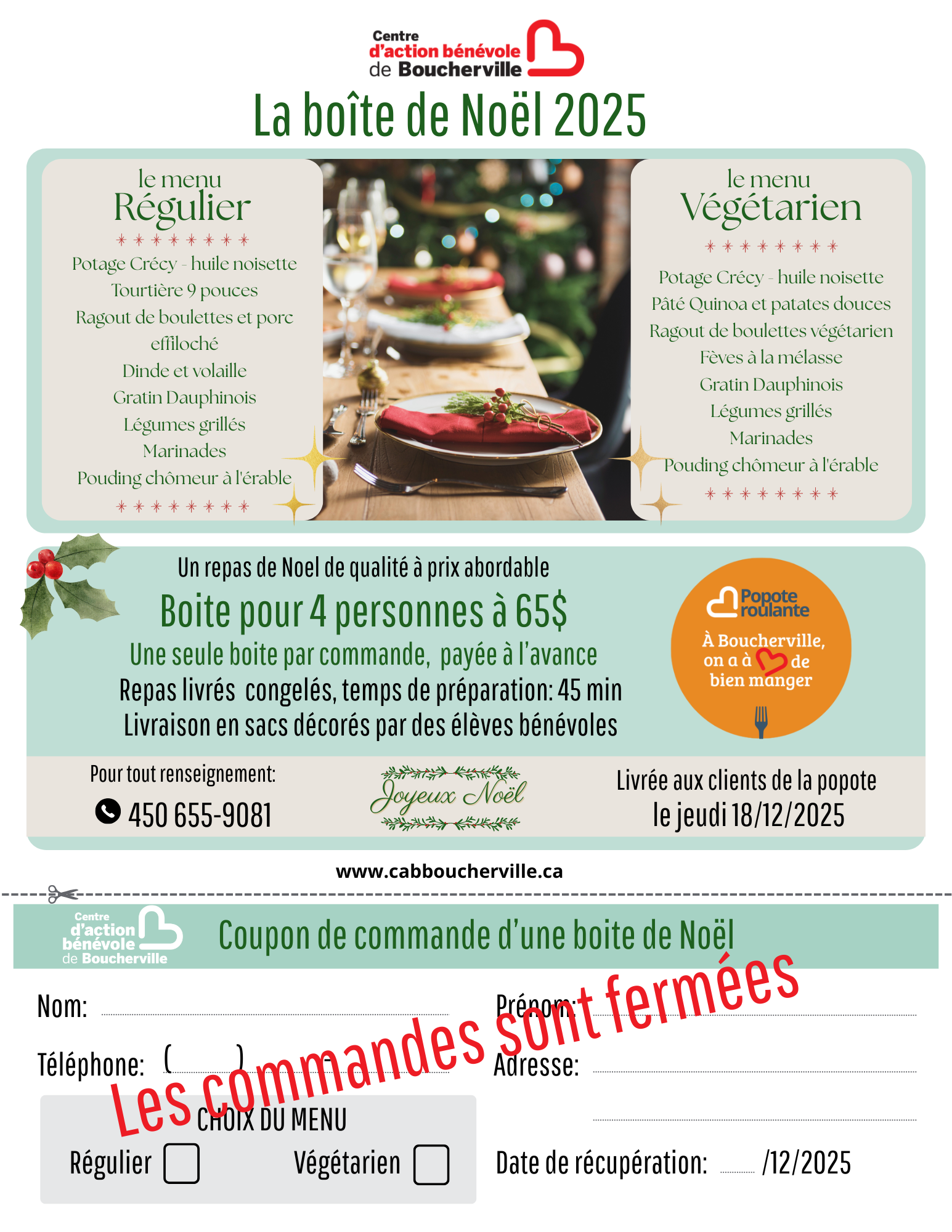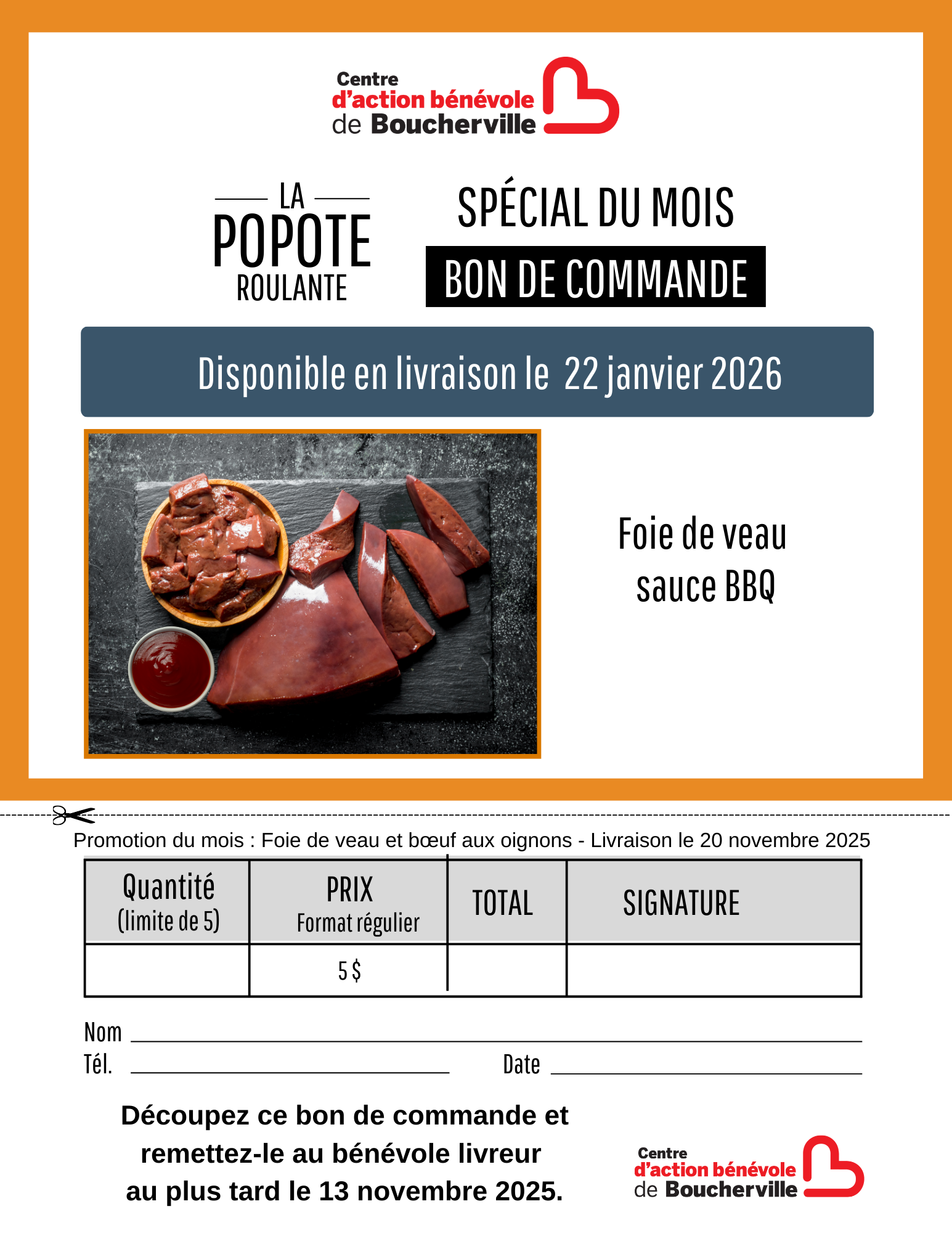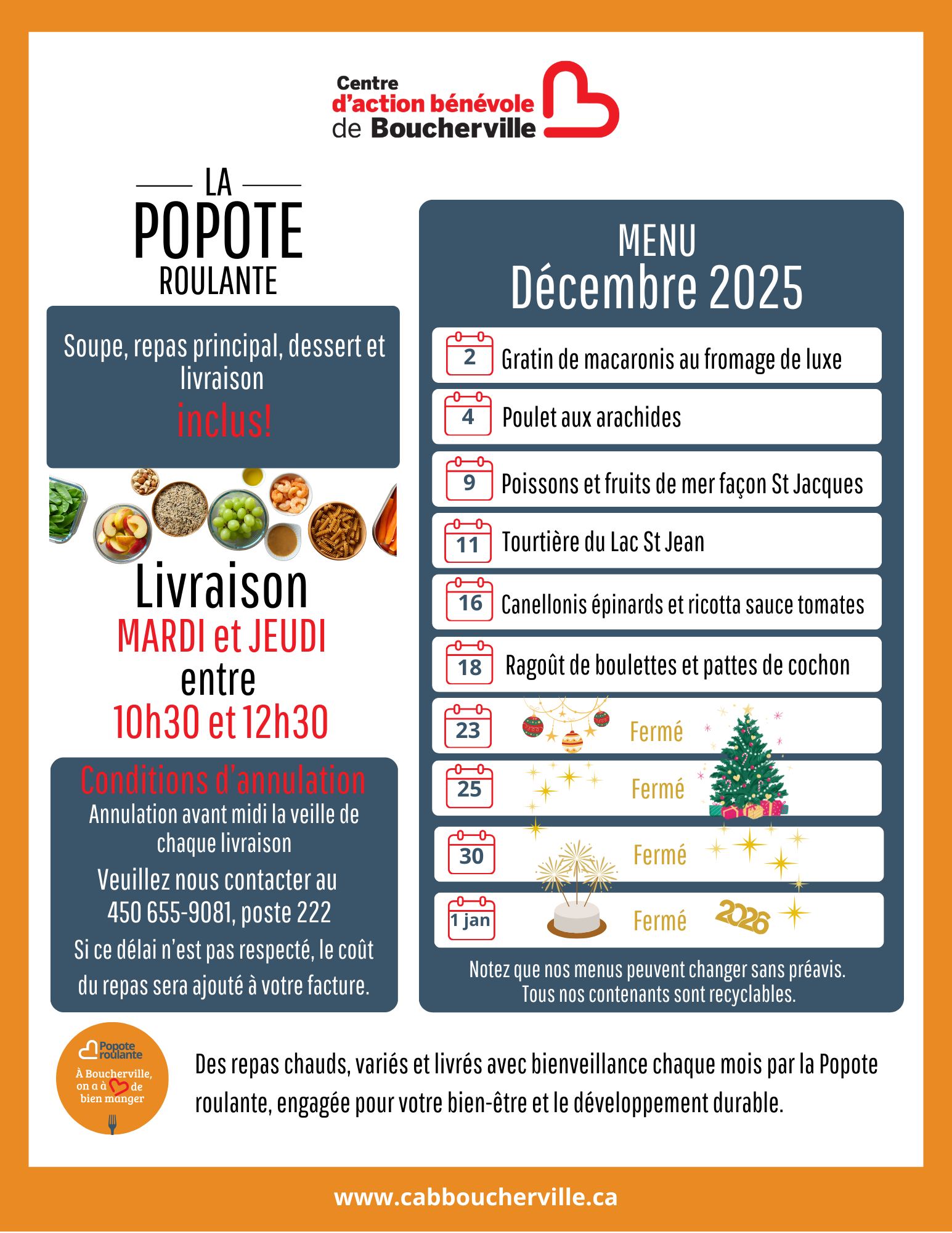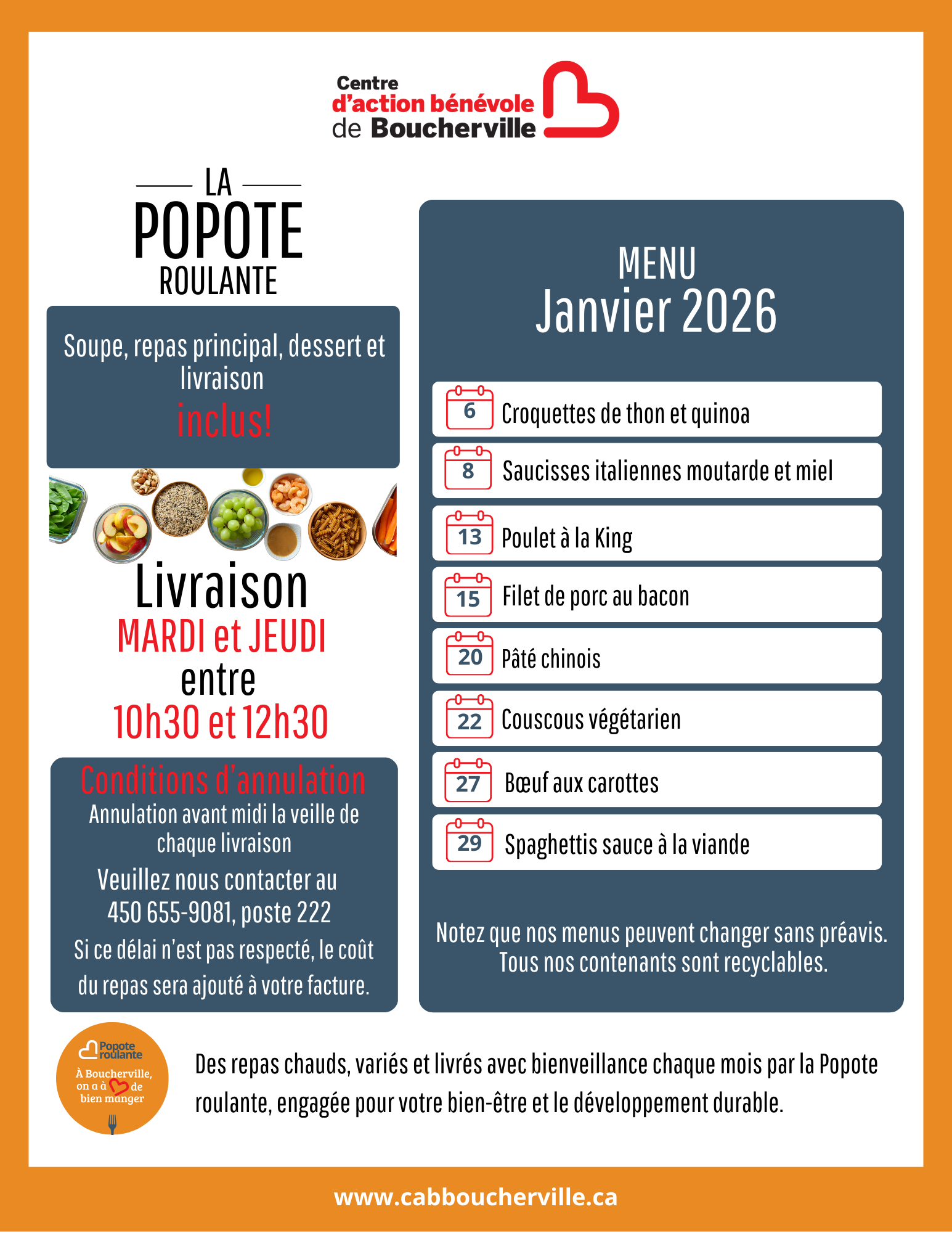 POPOTE ROULANTELa popote roulante offre un service de livraison de repas chauds à faible coût, préparés par notre équipe dévouée et acheminés à votre porte par nos bénévoles attentionnés. Au-delà d’un simple service de livraison de repas, nos bénévoles veillent à ce que tout se passe bien chez vous lors de chaque livraison et qu’il n’y ait aucun problème à signaler. C’est une excellente manière de rassurer vos proches et de vous apporter une tranquillité d’esprit. Nos repas, comprenant une soupe ou une salade, un plat principal et un dessert, sont livrés les mardis et les jeudis entre 10 h et 12 h 30. Chaque mois, nous élaborons un nouveau menu varié et faible en sel. De plus, vous avez la possibilité de demander des desserts spécialement adaptés aux personnes diabétiques. Nous proposons également, chaque mois, un repas différent que vous pouvez commander en plus grande quantité. Celui-ci vous sera livré frais à la fin du mois. La popote roulante contribue également à la lutte pour le développement durable grâce à la redistribution alimentaire. Notre collaboration avec Moisson Rive-Sud nous permet de récupérer les surplus et de les redistribuer à la population. En 2020, nous avons récupéré près de 25 000 kg de denrées. CONDITIONS D’ADMISSIBILITÉLe service est offert exclusivement aux résidents de Boucherville suivants : -Aux personnes en convalescence, quel que soit leur âge et leur revenu; -Aux personnes en situation de handicap ou en perte d’autonomie, quel que soit leur âge et leur revenu; -Aux personnes proches aidantes, quel que soit leur âge et leur revenu; -Aux familles ou individus vivant un moment difficile, quel que soit leur âge ou leur revenu; -Aux personnes de 65 ans et plus (automatiquement admissibles). TARIFS -Repas complet : 8,00 $ -Soupe : 1,50 $ -Dessert : 1,50 $ -Promotion du mois : 5,00 $ SÉCIAL DU MOIS SPÉCIAL DU MOIS PROCHAIN RÈGLES DE FONCTIONNEMENT DE LA POPOTE ROULANTE |
