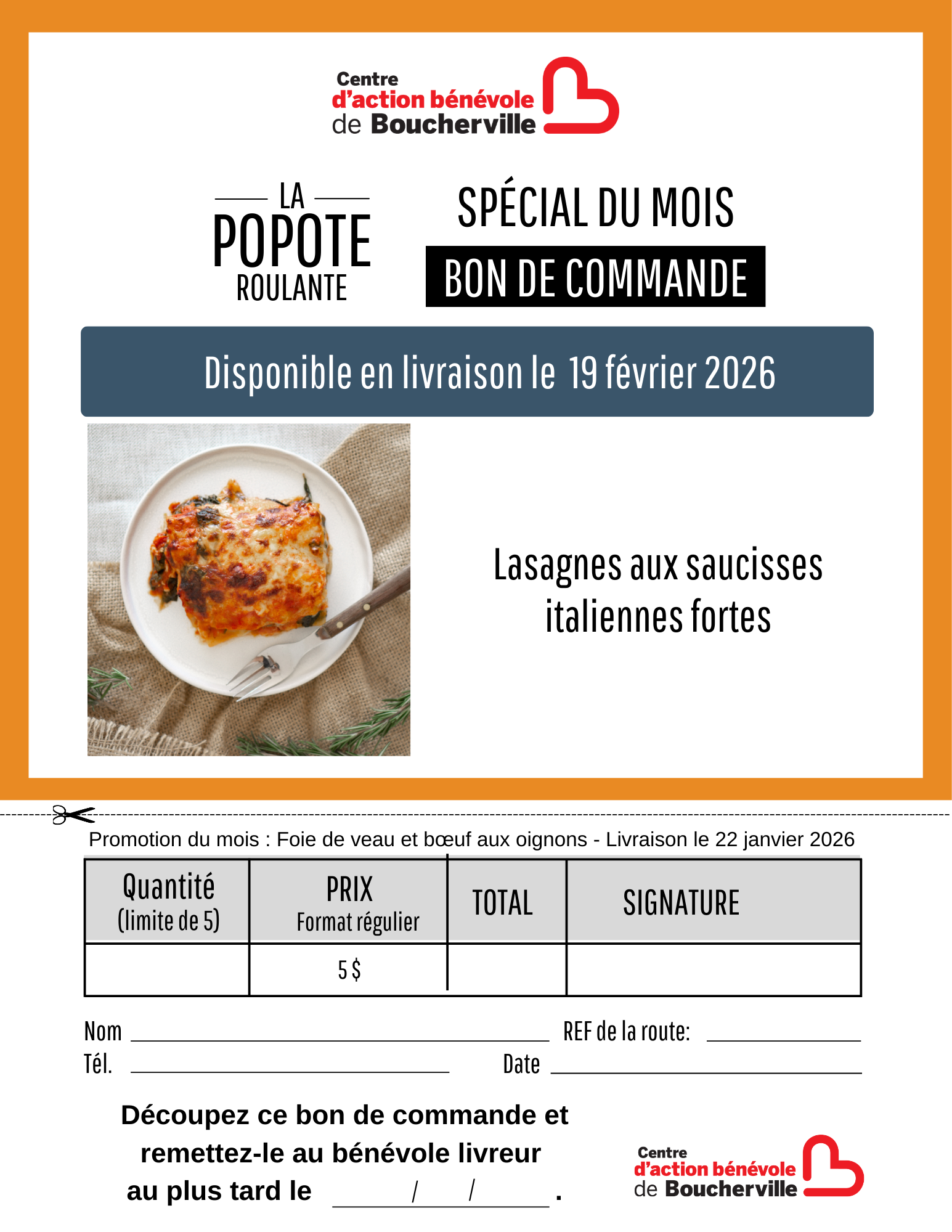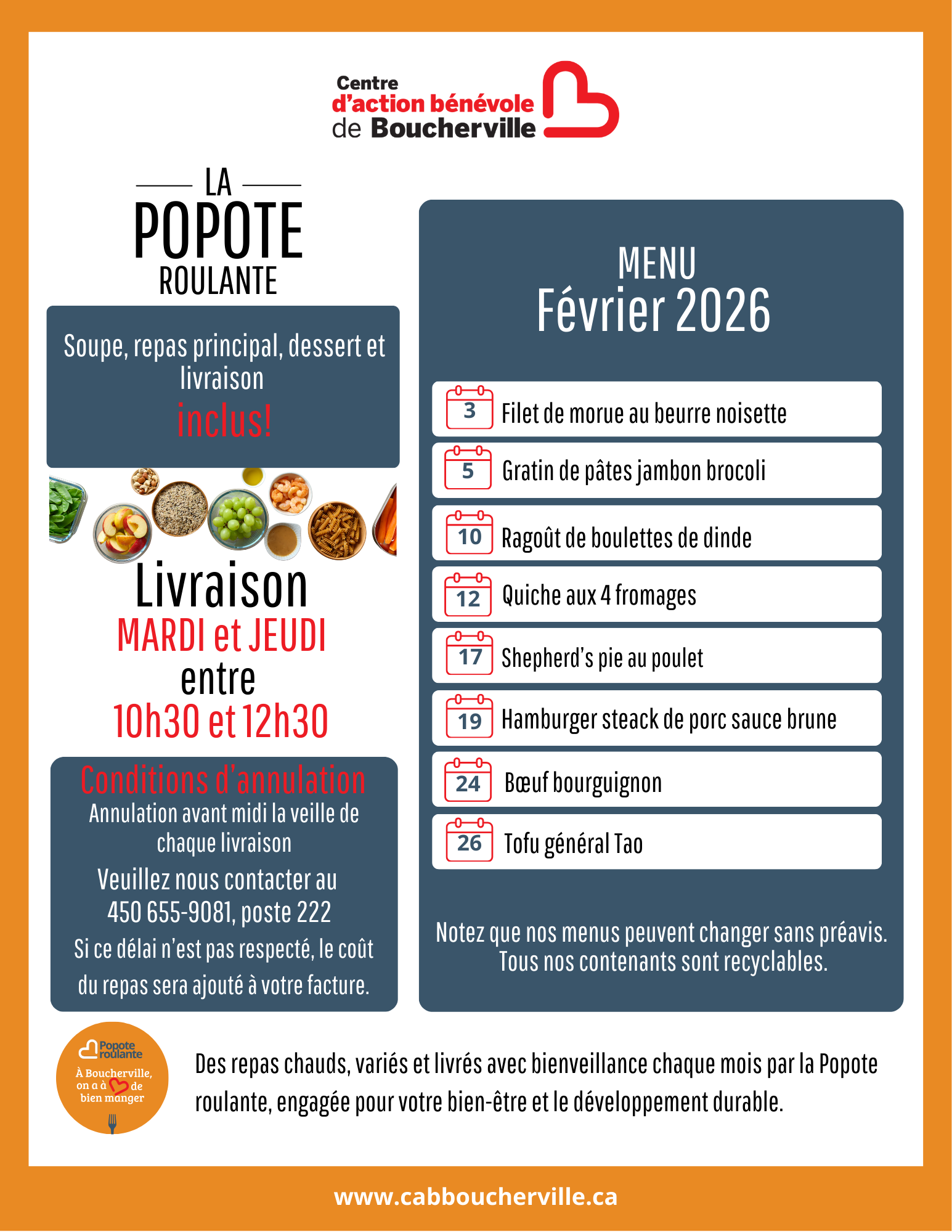 POPOTE ROULANTELa popote roulante offre un service de livraison de repas chauds à faible coût, préparés par notre équipe dévouée et acheminés à votre porte par nos bénévoles attentionnés. Au-delà d’un simple service de livraison de repas, nos bénévoles veillent à ce que tout se passe bien chez vous lors de chaque livraison et qu’il n’y ait aucun problème à signaler. C’est une excellente manière de rassurer vos proches et de vous apporter une tranquillité d’esprit. Nos repas, comprenant une soupe ou une salade, un plat principal et un dessert, sont livrés les mardis et les jeudis entre 10 h et 12 h 30. Chaque mois, nous élaborons un nouveau menu varié et faible en sel. De plus, vous avez la possibilité de demander des desserts spécialement adaptés aux personnes diabétiques. Nous proposons également, chaque mois, un repas différent que vous pouvez commander en plus grande quantité. Celui-ci vous sera livré frais à la fin du mois. La popote roulante contribue également à la lutte pour le développement durable grâce à la redistribution alimentaire. Notre collaboration avec Moisson Rive-Sud nous permet de récupérer les surplus et de les redistribuer à la population. En 2020, nous avons récupéré près de 25 000 kg de denrées. CONDITIONS D’ADMISSIBILITÉLe service est offert exclusivement aux résidents de Boucherville suivants : -Aux personnes en convalescence, quel que soit leur âge et leur revenu; -Aux personnes en situation de handicap ou en perte d’autonomie, quel que soit leur âge et leur revenu; -Aux personnes proches aidantes, quel que soit leur âge et leur revenu; -Aux familles ou individus vivant un moment difficile, quel que soit leur âge ou leur revenu; -Aux personnes de 65 ans et plus (automatiquement admissibles). TARIFS -Repas complet : 8,00 $ -Soupe : 1,50 $ -Dessert : 1,50 $ -Promotion du mois : 5,00 $ SpÉCIAL DU mois prochain RÈGLES DE FONCTIONNEMENT DE LA POPOTE ROULANTE |