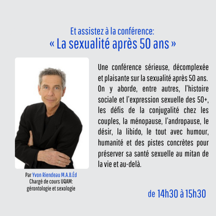 ConférenceNous aurons aussi une conférence intitulée: “La sexualité après 50 ans”, présentée par Yvon Riendeau, chargé de cours à l’UQAM en gérontologie et sexologie.